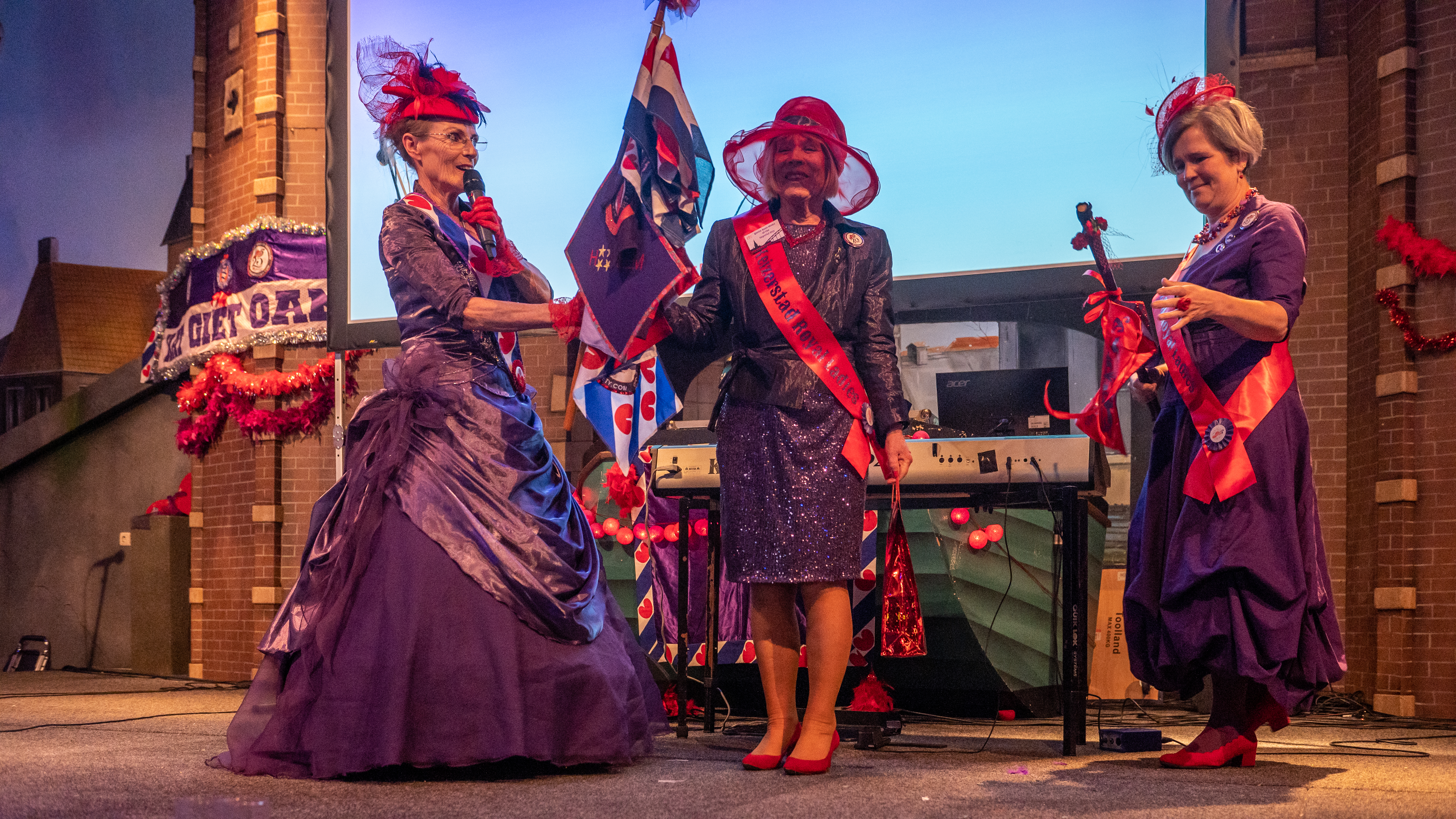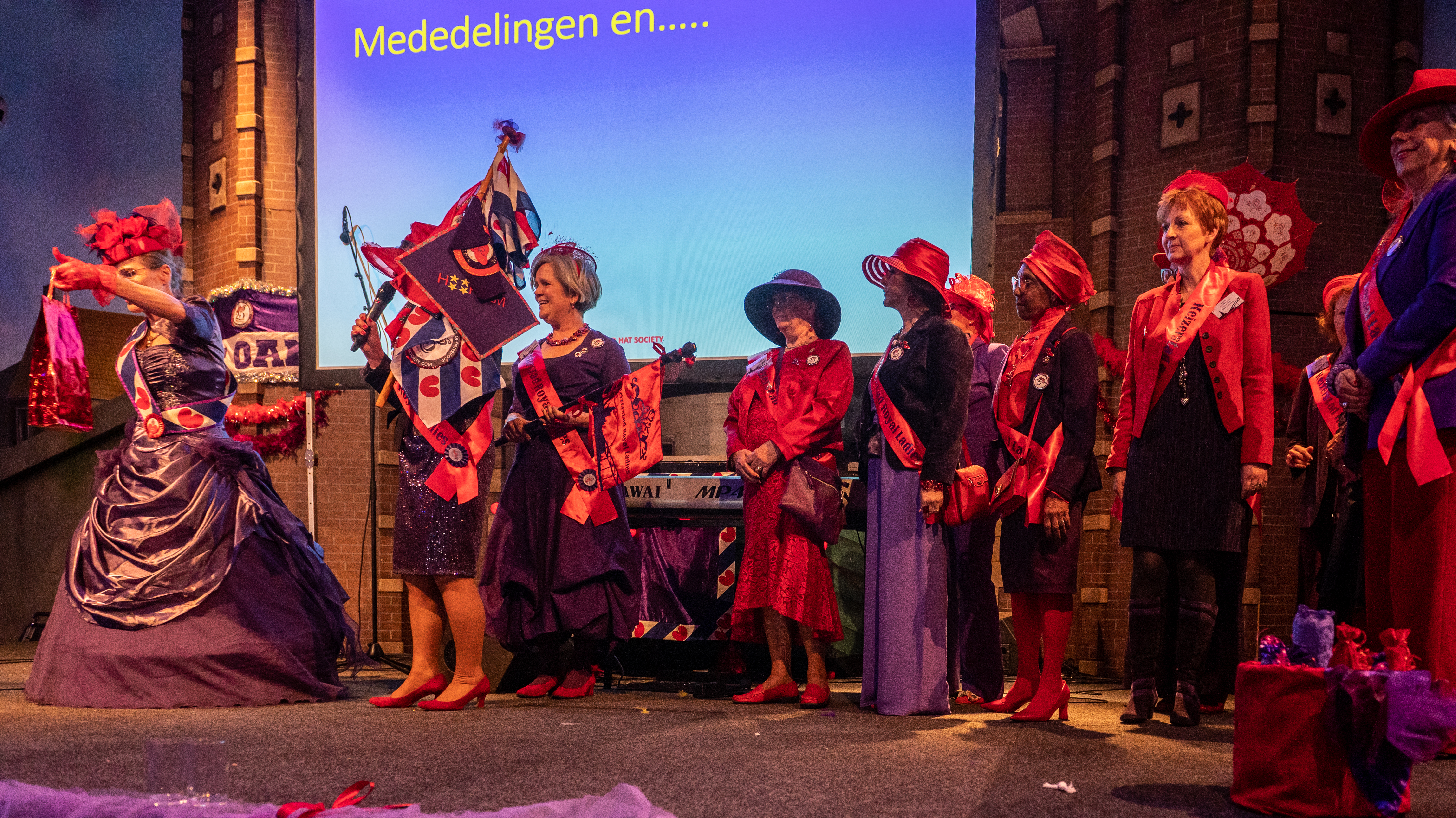 Queen Anne Mieke wordt uitgenodigd op het podium, maar neemt het hele gevolg mee.