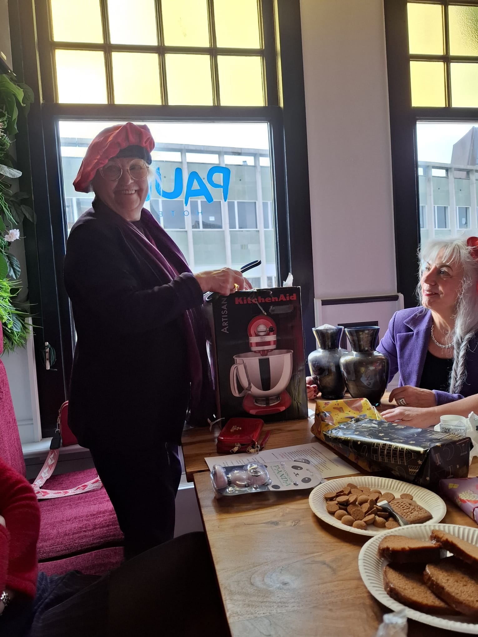 Wat een gezellige Ladies Talk op 23-02-2025 bij de jarige Jonkvrouw Iet van de Schilderkunst. Haar schilderijen (helaas niet op de foto’s, vergeten!) sierden de tafel met lekkere hapjes en in haar atelier boven mochten we haar vele kunstwerken bewonderen. We maakten ook kennis met een nieuw enthousiast lid, Hannerl, zie leden.